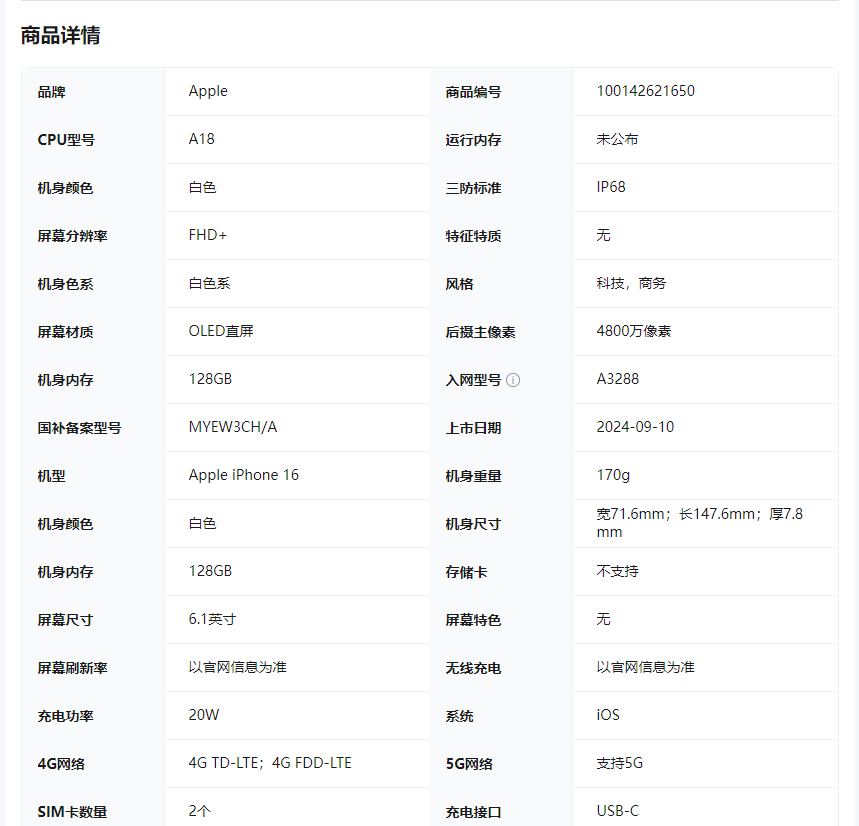 Apple/苹果 iPhone 16 128GB