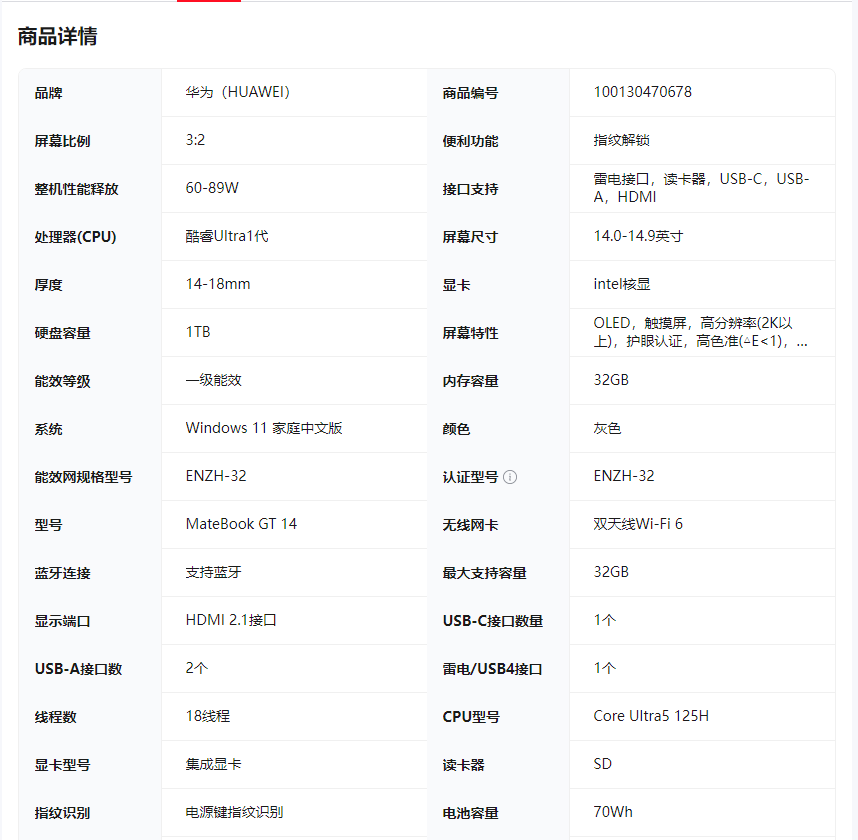 华为MateBook GT 14 酷睿Ultra 笔记本电脑 2.8K OLED悬浮屏Ultra 5 32G 1T深空灰